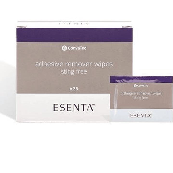 Toallitas Removedoras de adhesivo ESENTA™: la toallita está diseñada para eliminar cualquier residuo de adhesivo que quede en la piel. La silicona de la toallita se evapora en segundos, sin dejar ninguna película o recubrimiento, y se puede aplicar un nuevo dispositivo (si es necesario) sin necesidad de limpiar la piel.